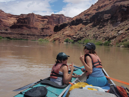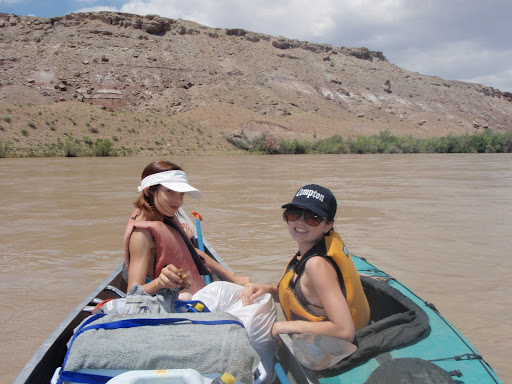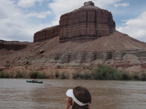 Once we got out on the river the weather brightened considerably, and, while it remained an unseasonably cool day for the Utah desert, it was a brilliant day to spend leisurely paddling fifteen miles down the Green River through Labyrinth Canyon. Early in the day, we were realxing along the river and I took this shot of the girls:
