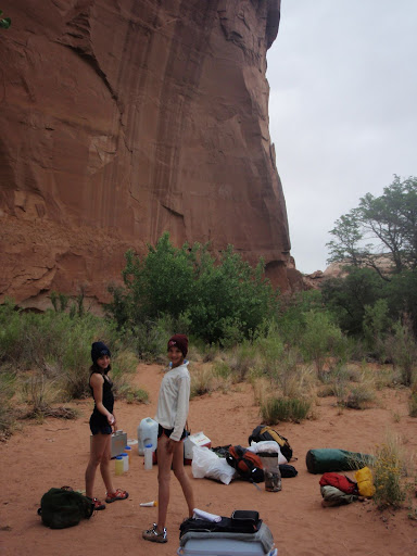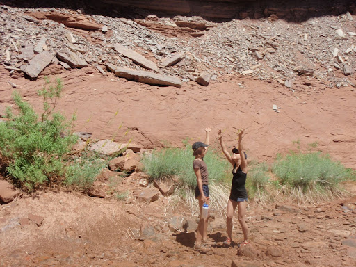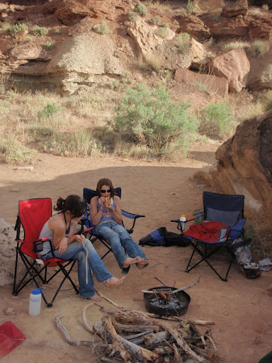 I should also note that both the shuttle driver and the office guy at Tex's definitely did a double-take when they saw the composition of our group--they both said to me, essentially, "are you sure you know what you're getting yourself into taking these two out on the river?" In fact, Darren's last words to me after he dropped us and all our gear off at Crystal Geyser, as he was preparing to drive the empty van back to Moab, said with a wry smile, were "You're a brave man."