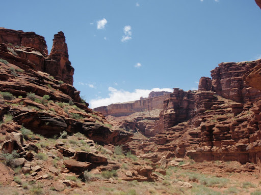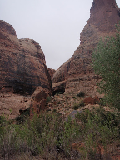 At high water, when all the sandbars are covered by the river's swift current, finding suitable campsites along the river can be a challenge. Where the river doesn't directly abut steep canyon walls there is normally thick, impenetrable vegetation blocking passage to the shore. Thus, side canyons, where you can often paddle the boats some ways up the high river's backflow to accessible ground, become favored campsites. A huge benefit of camping in side canyons is that you can explore them on foot from camp.