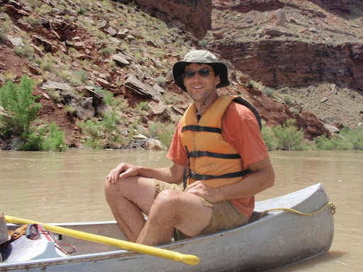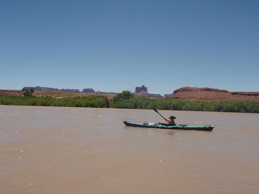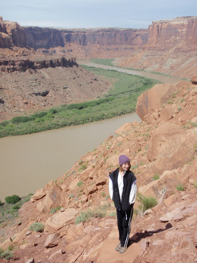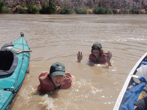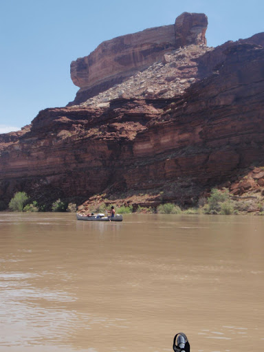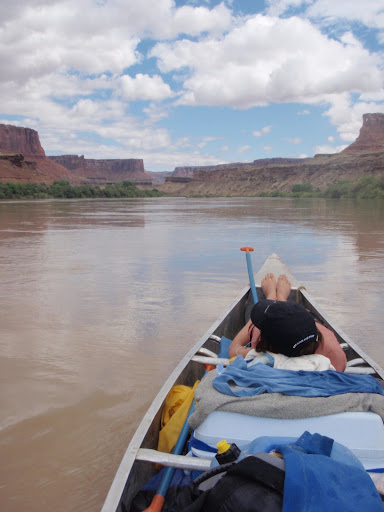 Shortly thereafter we were on the river for our final bittersweet five miles of (what's it called, boys and girls?) paddling. After one quick mile we reached the convergence of the Green with the more voluminous Colorado river. At this point you could see the two rivers, with their different silt compositions, and thus different colors, swirling together, becoming one. Aliy snapped a perfect self-portrait with the canoe in the background just above the convergence:
