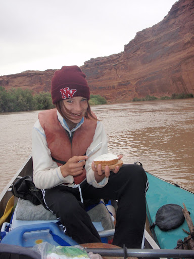With impressive speed and efficiency we broke down camp and got the boats loaded up for the day. As a light rain began to fall, we paddled down and re-entered the main current of the river well ahead of the larger group camped nearby. The day was going to be largely a play-it-by-ear day. I hoped to make big miles, but would remain flexible given the uncertain conditions. We paddled through gorgeous canyon country for a few hours, through intermittent rains and upcanyon winds. The girls continued to trade off between boats, and we enjoyed another lunch in the boats. You can see from the following photo of Isabelle proudly displaying her bagel that it was clearly much colder than the prior day: