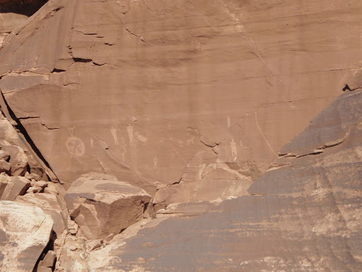On the way back, of course we had to backtrack along the unpleasant approach hike, but we made a side diversion up to some well-preserved Indian pictographs along the section of canyon wall (these were discovered by Nao the prior year). The girls were actually so tired that they only approached just close enough to see the rock art, but I got a fair bit closer and snapped the following photo: