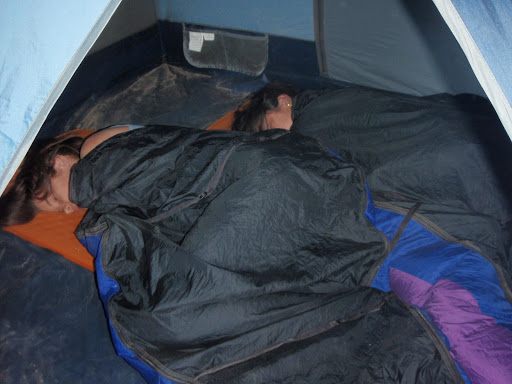 As it's getting fully dark, I pass the veggie dogs into the tent for the girls. They seem to enjoy these as I've rarely seen them enjoy any food in their lives. I sit outside in the growing darkness devouring my own sirloin burgers. Soon thereafter I climb into the tent, and we are all quickly asleep.