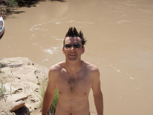 Another eight miles of beautiful, serene paddling would bring us to our final camping spot of the trip, at Powell Canyon. While the access to the site was steep and rocky, it was actually quite a nice site, with several excellent places for tents and a pleasant riverside lounging area. Unfortunately, though, the orientation of the canyon at that point left us exposed to direct sunlight well into the evening, and the girls had both suffered painful sunburn on their upper thighs. I encouraged them to wet some t-shirts and drape them over their laps. This seemed to afford them some relief. After setting up camp, I opted to go for a swim and the girls felt compelled to snap a photo of my post-swim hair: