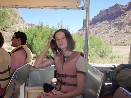 Soon enough the jetboat arrived, Driven by the charismatic Darren. After we all got our gear and boats securely stowed on the water taxi, we settled into our seats for the two-hour, fifty-mile ride up the Colorado to Potash boat-ramp near Moab. Here is Isabelle relaxing on the jetboat:
